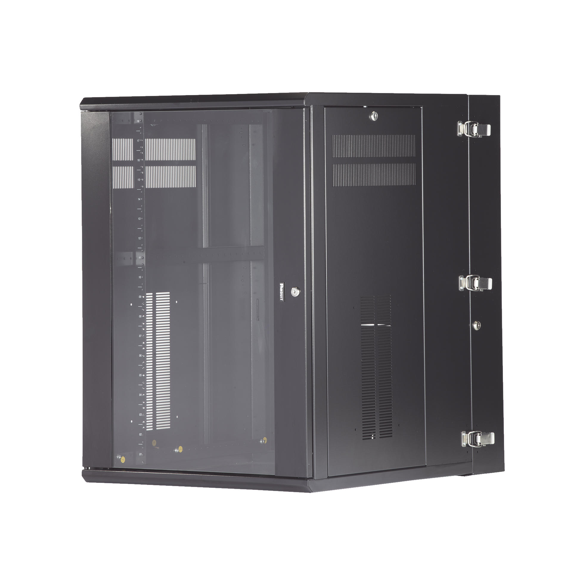 Gabinete de montaje en pared construido en acero, soporta 18 unidades de Rack para equipos de red activos o pasivos. Cuenta con paneles laterales totalmente desmontables y esta diseñado para permitir el control de clima adecuado para uso con diversos equipos de red, así como Switches de alimentación remota (PoE) y fuentes de alimentación ininterrumpida (UPS).