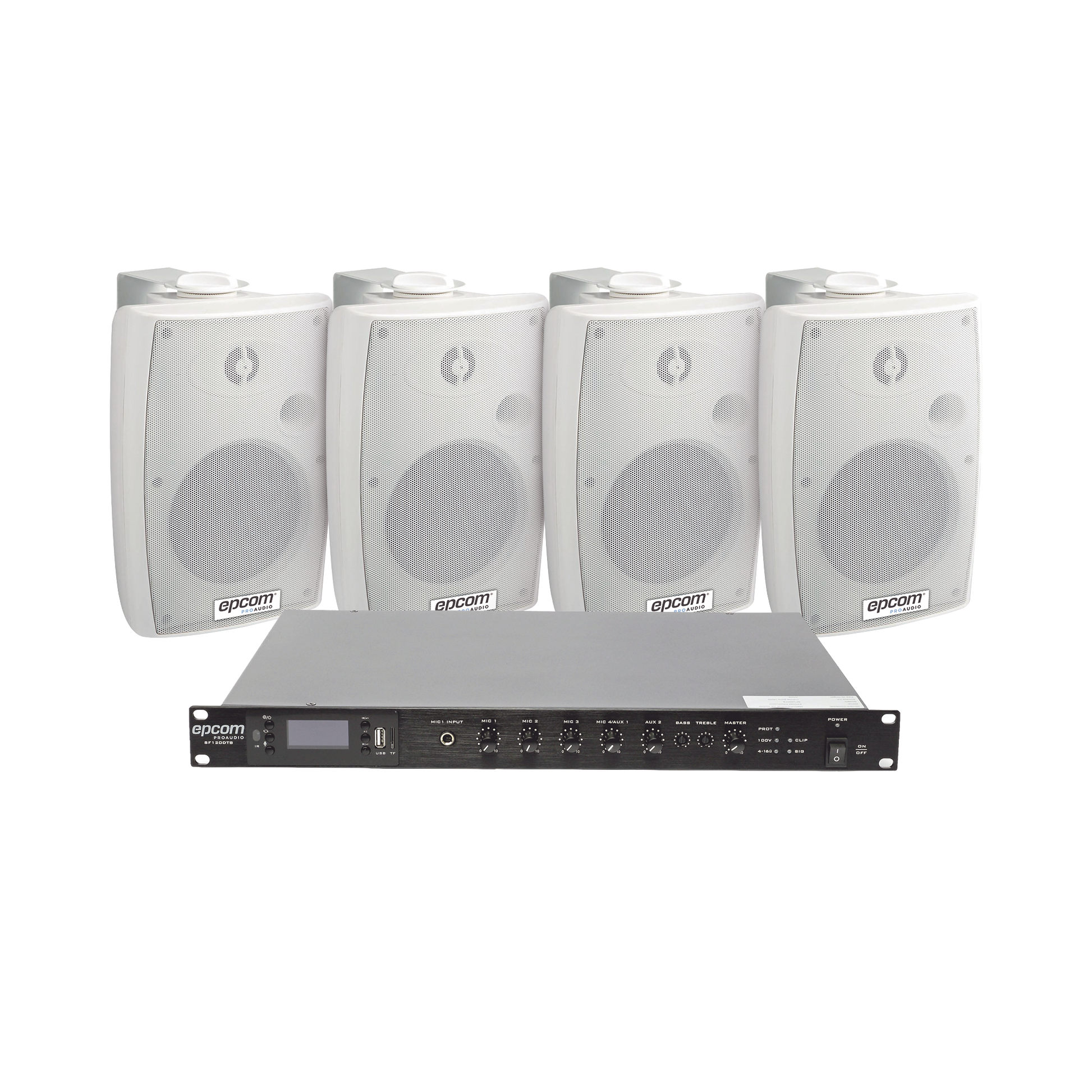KIT de Amplificador de Audio 120W para Rack | 4 Altavoces de Pared color Blanco 2.5W - 20W | Sistema 70/100V